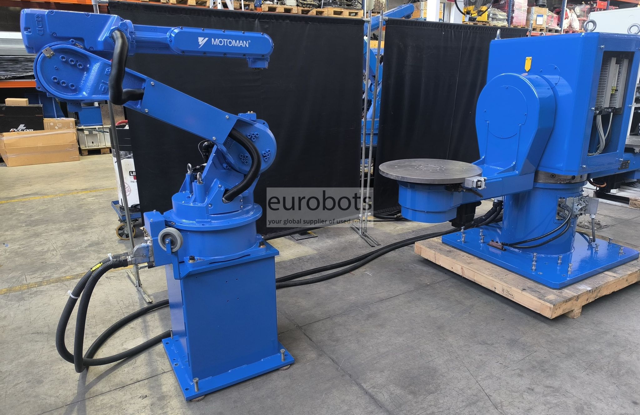 Este é um sistema com um posicionador basculante em forma de L duplo da Motoman-Yaskawa. Sua capacidade de carga é de 500 kg por lado.